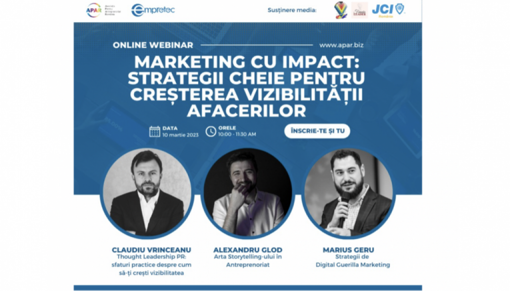 Pentru că știm cât de important este să crești continuu vizibilitatea afacerii din care faci parte te invităm să participi la webinar-ul gratuit, organizat online de Asociația pentru Antreprenoriat din România, în data de 10 MARTIE, ora 10.00. De ce să participi la webinar-ul dedicat creșterii vizibilității afacerilor Alături de antreprenori cu experiență notabilă atât în marketing, cât și în business, am pregătit pentru tine informații pe care cu siguranță vei dori să le iei în considerare în strategia de promovare a afacerii tale. Indiferent că ești la început de drum sau conduci un business cu vechime, participarea la webinar te va ajuta să consolidezi informațiile de care ai nevoie pentru a crește vizibilitatea afacerii tale. Timp de 1 oră și jumătate vei avea acces la 3 sesiuni intera...Read More