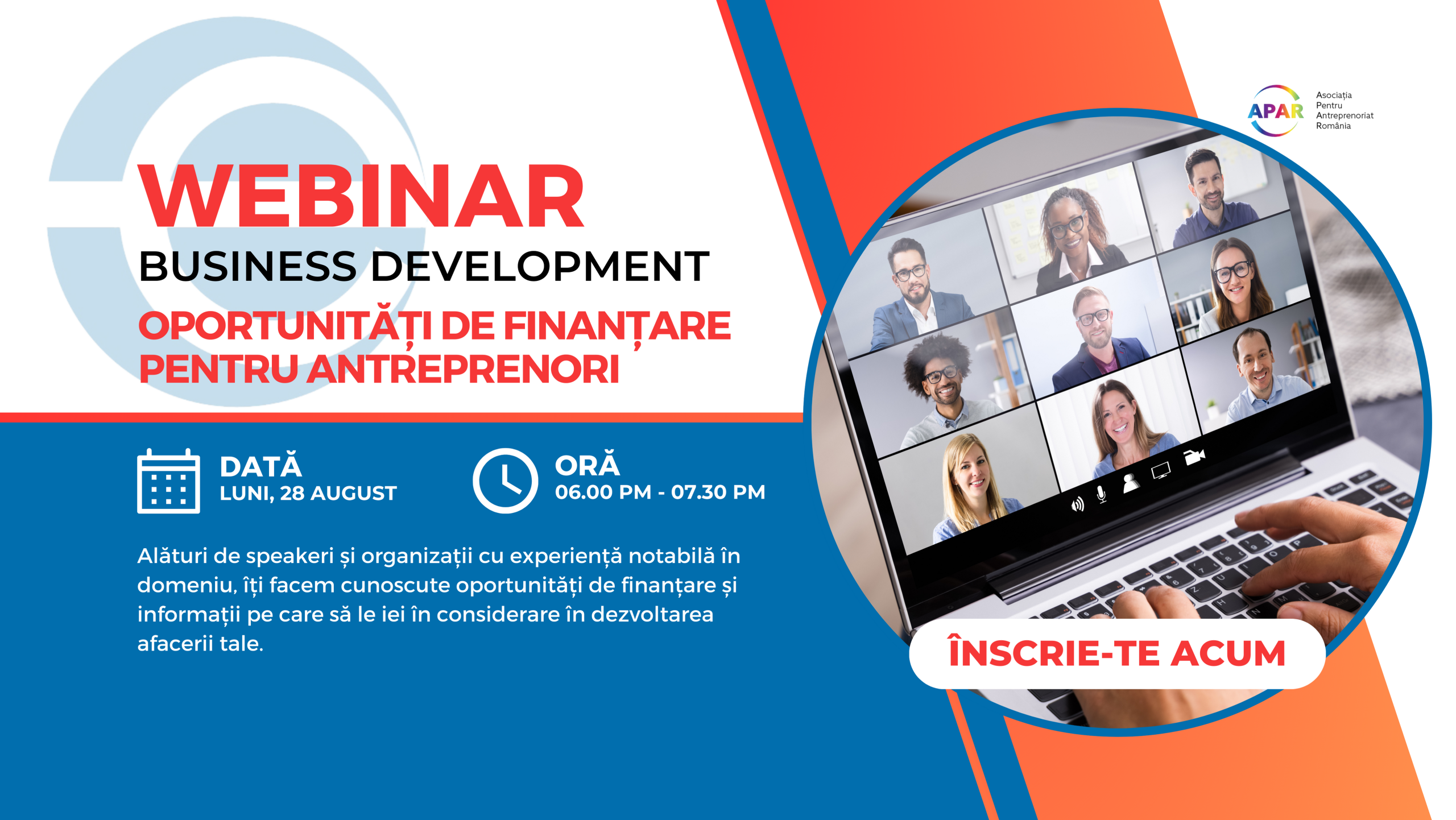 APAR – Asociația pentru Antreprenoriat din România organizează Luni, 28 August 2023, începând cu ora 18.00, un webinar dedicat antreprenorilor care doresc să afle informații utile despre sursele de finanțare disponibile pentru dezvoltarea business-ului lor.